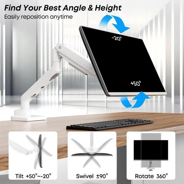Full Motion Design: This monitor arm features 50 tilt up and 20 tilt down, 180 swivel, 360 rotation and 20" height range for superb flexibility, allowing you to place screen in the best view or elevate your monitor to relieve neck and back strain and optimizes desk space ^^ Pneumatic
