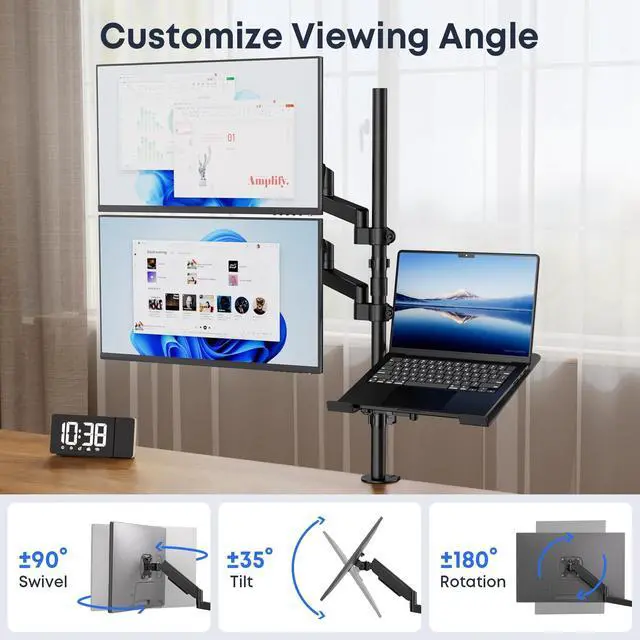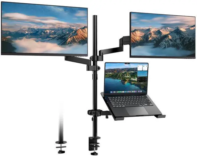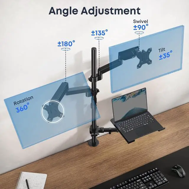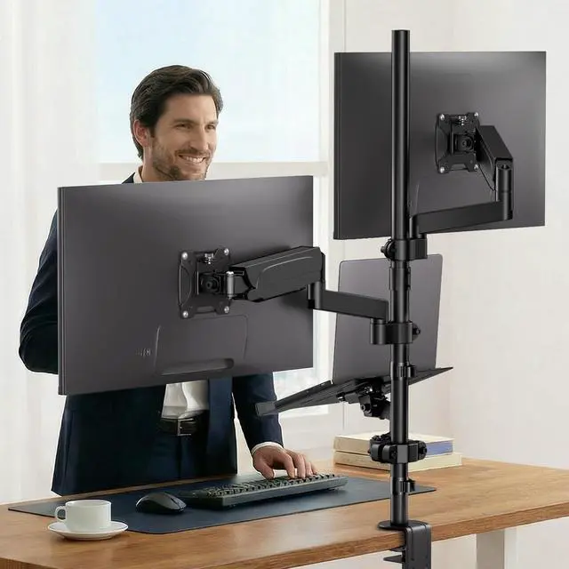 All-in-One Ergonomic SolutionFree up your desk and boost productivity. This 3-in-1 stand holds two monitors and a laptop on its extra-long 35-inch pole, giving you the space and flexibility to achieve a perfectly comfortable, neck-strain-free setup ^^ Fits Most Monitors & LaptopsCompatible with two 17" to 32" monitors (up to 19.8 lbs each) and a 10" to 17" laptop. Features universal VESA 75x75mm and 100x100mm support. The spacious tray securely holds your devices for a versatile workstation ^^ Easy & Full AdjustabilityEasily position your screens with smooth gas spring arms. Each arm offers 360 rotation, 90 tilt, and 90 swivel.