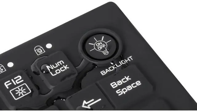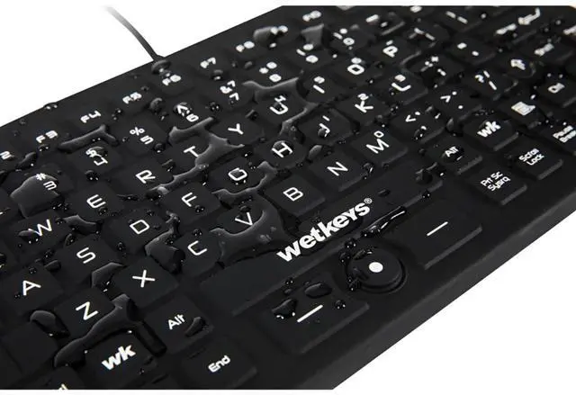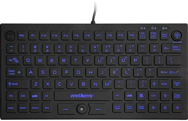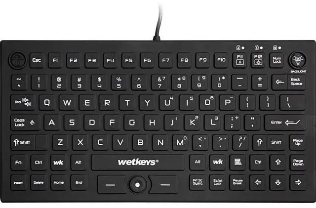 DESCRIPTION - WetKeys Professional-grade Mid-size Rigid Silicone Waterproof Keyboard with Pointing-Device, Backlight and ON-OFF Switch (USB) (Black) ^^ KBWKRC89PB-BK ^^ KEYBOARD LAYOUT - Small footprint, 89 low-profile silent keys (no clicking) including 12-function-keys and, number-pad overlay. ^^ KEYBOARD FEATURES - Rigid, fully-sealed silicone with no crevices for liquid and debris to get trapped in. Integrated pointing device with left/right click buttons, backlight, and ON-OFF switch. ^^ CORD CONNECTIVITY - Plug and play USB interface for a quick and smooth configuration. No software installation or special drivers. 1.6 -meter cord with USB connector.