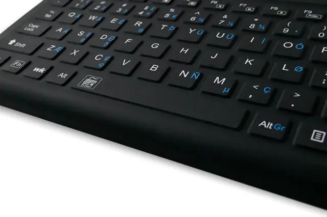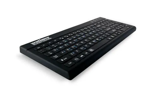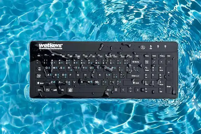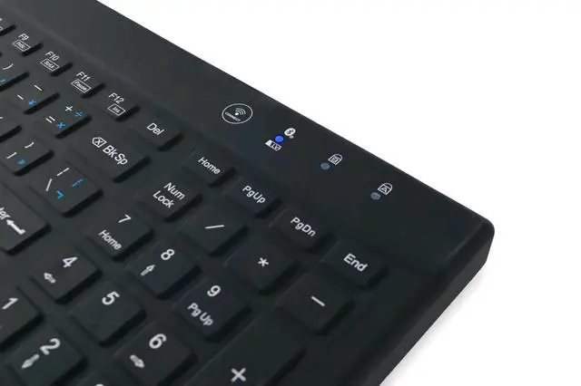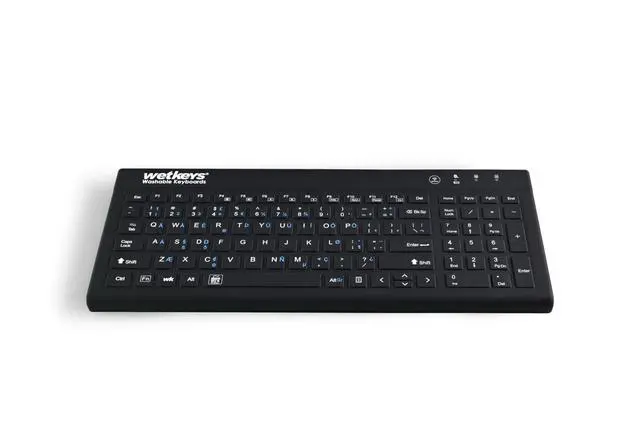 DESCRIPTION - WetKeys 'Blue Connect' Professional-grade Rigid Silicone Waterproof Wireless Bluetooth Keyboard with ON/OFF Switch (BT) (Black) ^^ KBWKRBT99Si-BK ^^ KEYBOARD LAYOUT - Full-size, 99 low-profile keys including 10-key numeric pad plus 12-function keys. Rigid, silicone plastic. ^^ KEYBOARD FEATURES Fully sealed with no crevices or gaps for dust, dirt, or debris to accumulate. ^^ WIRELESS CONNECTIVITY - A plug-and-play Bluetooth interface for quick and smooth configuration. No software installation or special drivers. ^^ TYPEABILITY - 8/9 out of 10. ^^ USES - Ideal for all regular-use environments at home and in offices, medical & dental facilities, laboratories, food processing, manufacturing, industrial use, and more.