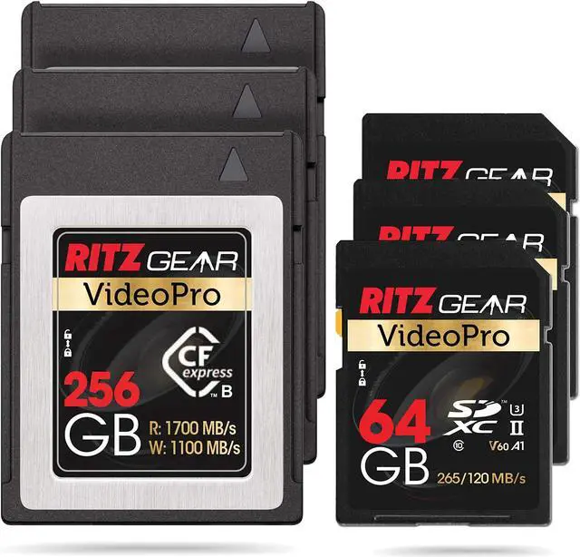 RITZ GEAR VideoPro CFExpress Type B 256GB Card (1700/1100 R/W) (Not Recommended for Nikon Cameras). + UHS-II 64GB SDXC Memory Card U3 V60 A1 (Pack of 3 Units)