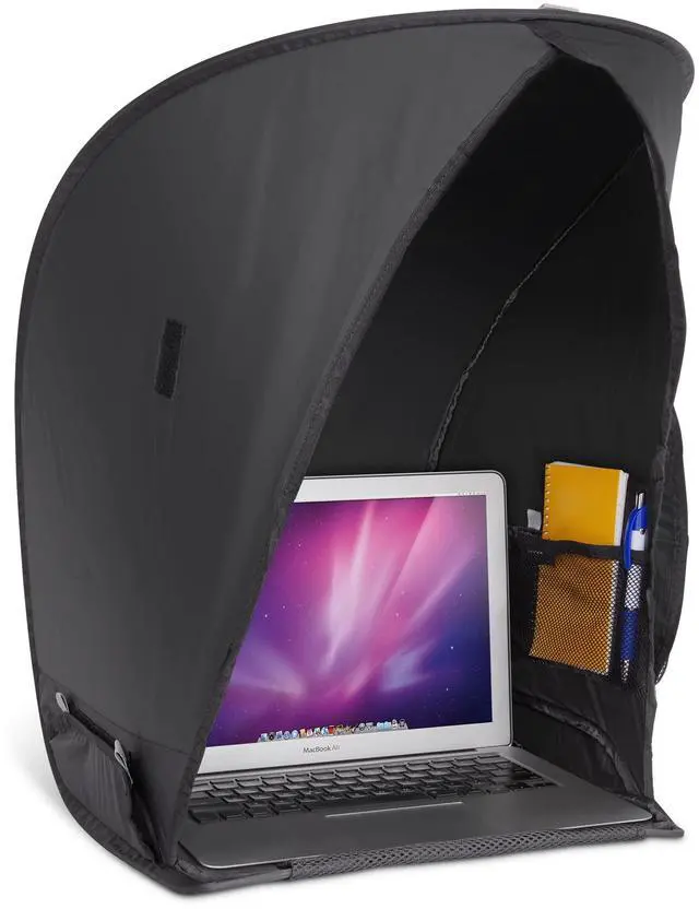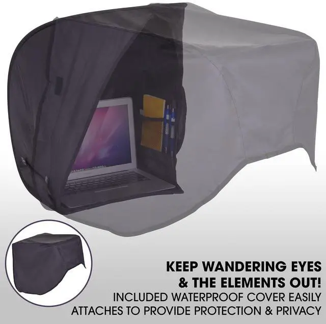PROTECTS your laptop, tablet or phone from sun glare, heat, and prying eyes outdoors ^^ FITS devices up to 17 inches; folds into a lightweight, compact carrying case ^^ WATERPROOF and durable fabric blocks rain, snow, UV rays for all-weather use ^^ FEATURES built-in handles, storage pockets and openings to organize cords ^^ REDUCES eye strain and visual fatigue by blocking sun glare on your screen