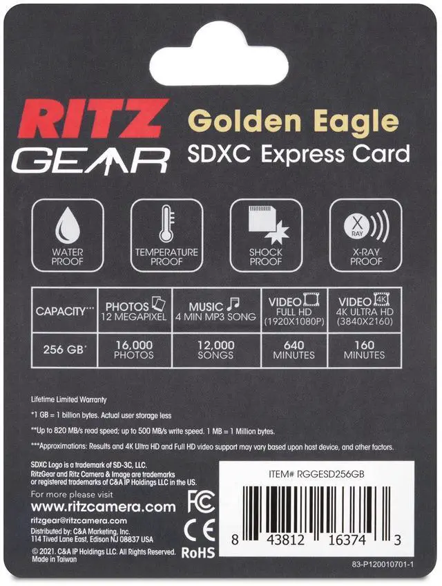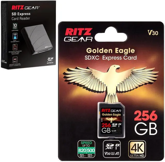- NEXT GENERATION IMAGING STORAGE ^^ The Ritz Gear Golden Eagle SDXC 7.0 Express Memory Card Leverages Todays Most Powerful Storage Protocols to Deliver Speeds Up to 3X Faster than Even the Quickest UHS-II SD Cards ^^ Take Your Professional Pursuits to the Next Level as You Save, Store & Transfer 1080p Full HD, 3D, 4K, 8K, 360 & Slow Mo Video, RAW Burst Mode & High Definition Photography ^^ - BLAZING-FAST SPEEDS FOR BEST RESULTS ^^ Experience the Ultimate in Express Data Transfer for High-Demand Digital Applications Including Still Imaging, Video Recordings, UHD Gaming Systems, Multi-Channel IoT Devices, High-Speed Backups, Automotive Intelligence, CCTV Systems & Temporary Storage for 5G Data Transfer ^^ SD 7.0 Boasts Extreme Speeds Up to 820 Mb/S [Read] & 500 Mb/S [Write] ^^ - EXTREME VELOCITY MEETS MAX CAPACITY ^^ In Addition to its Supercharged Transfer Rates, Golden Eagle Offers Extended Storage, Serving as a Mobile SD Card & Removable Solid-State Drive (SSD) All in One ^^ 256 GB Storage Capacity Easily Holds Up to 16, 000 12MP Photos, 12, 000 MP3s, 640 Minutes of Full HD Video or 160 Minutes of 4K Ultra HD Video ^^ Perfect for Digital Cameras, Camcorders, PCs, Etc.