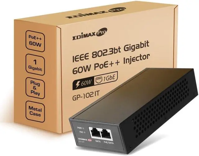 Edimax Pro Gigabit PoE++ 60W (30W/15W Compatible) Injector Adapter, Adds Power to PoE Powered Device (PD) Device for up to 100 Meters (328ft), Supports 802.3af 802.3at 802.3bt, GP-102IT