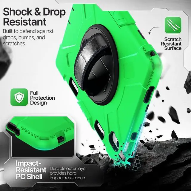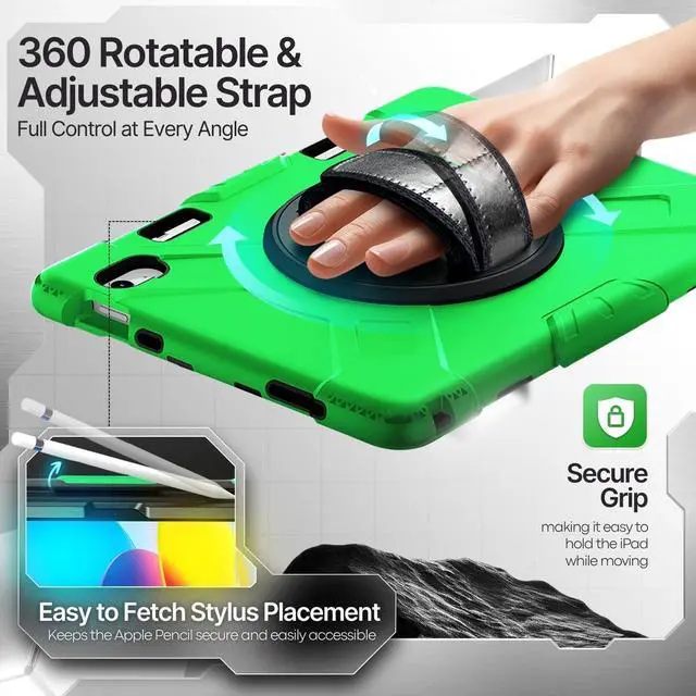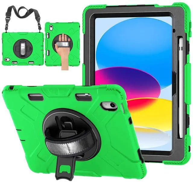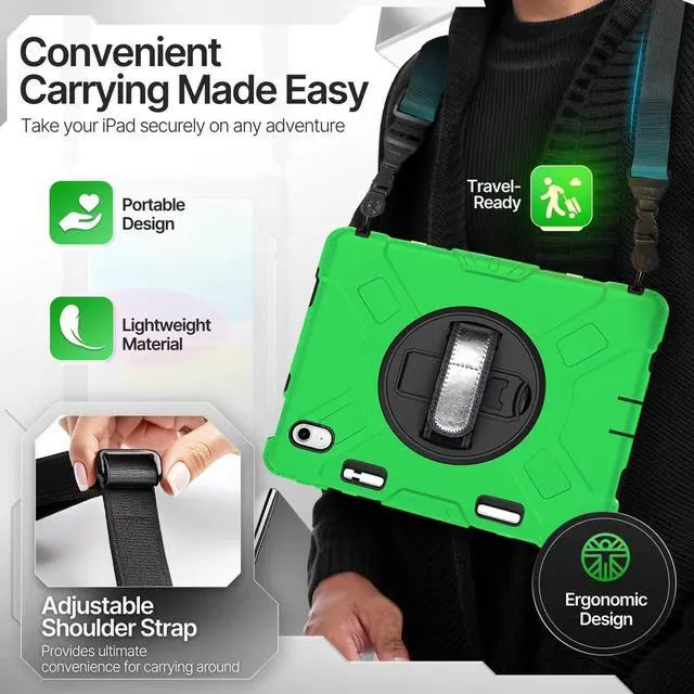 Content: 1x Protective Case for iPad 10.9 Inch 10th Generation 2022 - Shockproof Cover Case with Pencil Holder, Rotating Handle, Adjustable Stand & Shoulder Strap (Model: A2696, A2757, A2777), Green