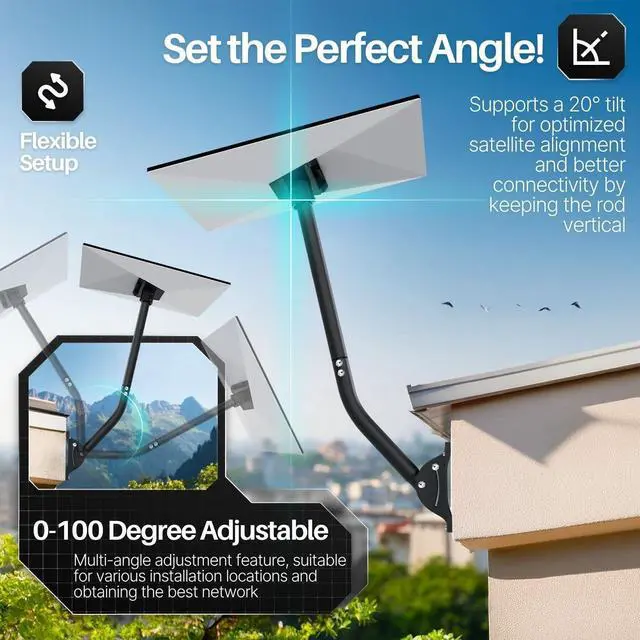 Optimize setup for Gen 3 Starlink mount with an adjustable mounting kit designed for roof and wall installations. The 100-degree adjustable angle and 20-degree tilt provide precise satellite alignment for Starlink mounts, enhancing signal strength, speed, and stability. Built with a durable aluminum adapter, it resists cracking, warping, and breaking under extreme weather conditions, outperforming plastic alternatives. The versatile 30-inch reversible mount pipe fits various setups for Starlink gen3 mount, including deep eaves, making it adaptable for different needs. Engineered with stainless steel, this mount withstands strong winds, heavy snow, and extreme temperatures for reliable year-round performance.