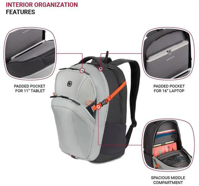 Elevate your style game while conquering the demands of college life or the professional world with the SwissGear UrbanPro Laptop Backpack. A modern masterpiece of design, this classroom and commuter backpack is tailored to the taste of trendsetting college students and young professionals who refuse to compromise on style. The cool bicolor scheme not only sets you apart but also complements your dynamic lifestyle perfectly. Dive into its features, and you'll discover that this transport backpack is the pinnacle of functionality. Safeguard your tech with the help of a triple-protected laptop, work, and travel compartment that accommodates laptop, work, and travels up to 16 inches and ensures your device remains as stylishly secure as you.