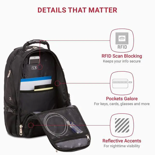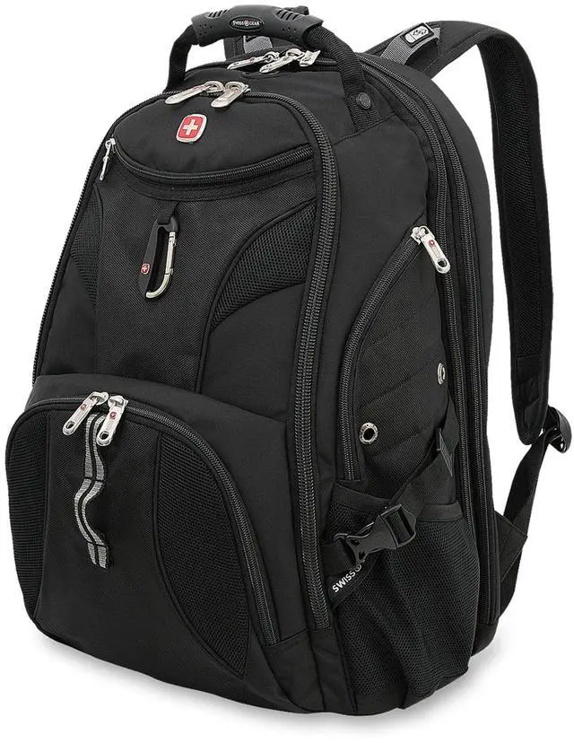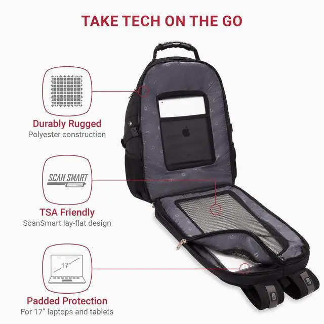 DescriptionThe SwissGear 1900 ScanSmart Laptop Backpack is a highly functional backpack for taking your tech on the go. It features a padded, TSA-friendly SmartScan tech compartment that fits a 17 laptop and 10 tablet and lays flat through airport security, as well as built-in RFID scan blocking technology to keep your information secure. An impressive array of integrated organizers keep essential pens, keys, and other electronic accessories within reach. The Airflow back panel and ergonomically contoured suspension straps feature padding and mesh fabric for maximum comfort and reflective accents for improved nighttime visibility.