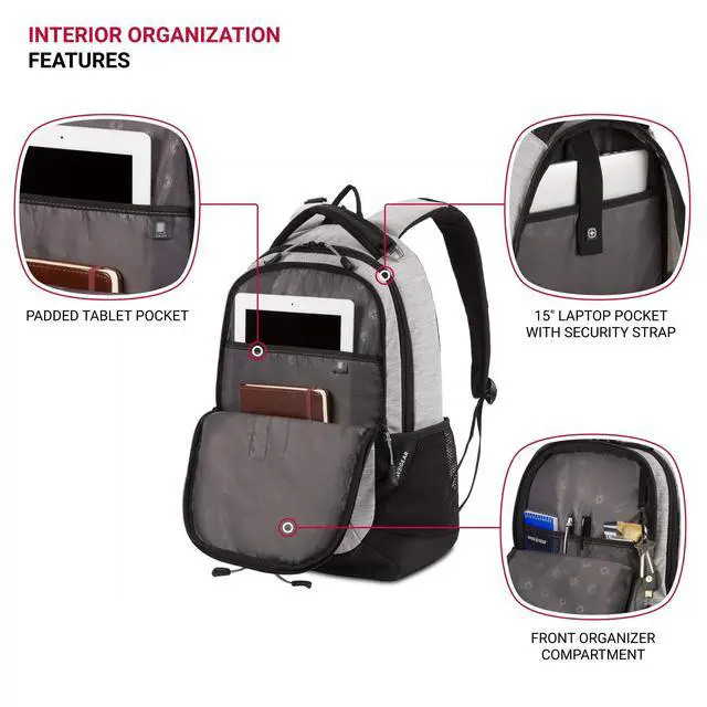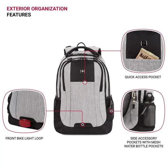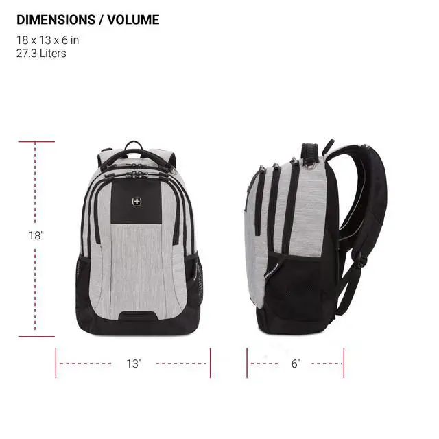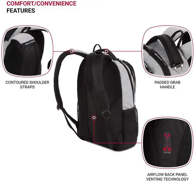 DescriptionThe SwissGear 5505 Cecil Special Edition Laptop Backpack is a highly functional backpack for your everyday. It features a large main compartment with padded pockets for most 16 laptops and 10 tablets. An essentials organizer keeps cables, pens, and other accessories safe and secure. The Airflow back panel and padded, contoured shoulder straps feature breathable fabric for maximum comfort, while a reinforced grab handle makes handling easy. With exterior water bottle pockets, adjustable compression straps, a dedicated glasses loop, and D-ring buckle and web vista loop for external gear attachment, this bag is packed with convenient features that add delight to your daily carry.