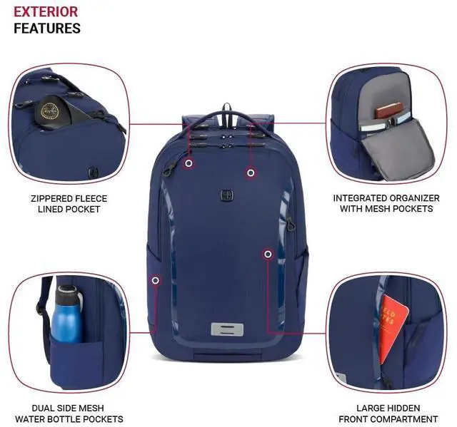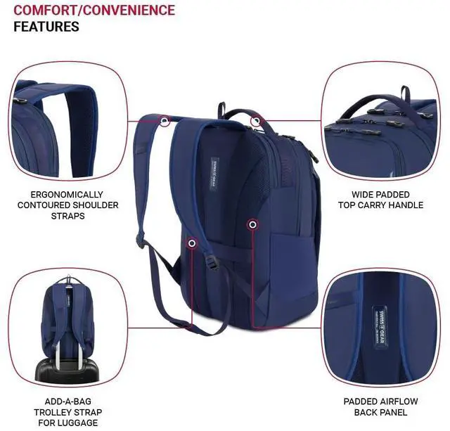 Add-a-Bag Strap: A must-have travel backpack for men and women, this SwissGear backpack includes an add-a-bag rear strap that fits over luggage extension handles for easy and convenient movement through airports