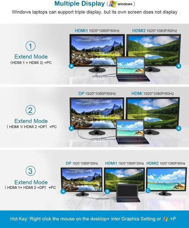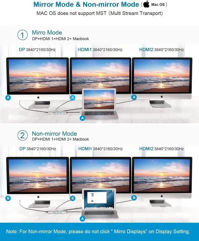 Ultra HD 4K HDMI Output and Triple Display: The Multiport Adapter with 2 HDMI ports and 1 DP port can expand or mirror your screen with the video output port and directly stream 4K@30HZ UHD or full HD 1080P video to HDTV, monitors or projectors, and you can enjoy movie-level visual effects. Triple display: one screen of a laptop, one display of HDMI output, and one display of another HDMI or DP port. Note: only the Windows system supports MST but the Apple Mac OS system does not.