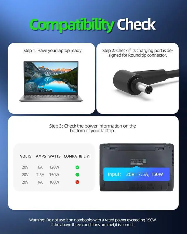 Output Max - 20V 7.5A 150W (compatible with 19.5V 6.15A 120W) Input Volt Range - 100-240V