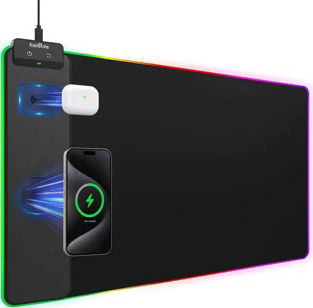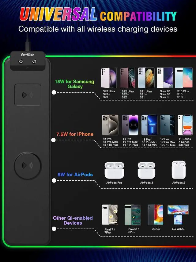 [(The first 3 in 1 Wireless Charging Mouse Pad on the Market)] Extrelife rgb gaming mouse pad combines 2 in 1 wireless charging station(iphone/airpods wireless charger), mouse pad into one. With dual pads charging surfaces, you can charge your iphone/Samung Phones and Airpods simultaneously without additional cables cluttering on your desk. Keep your desk organized and tidy.