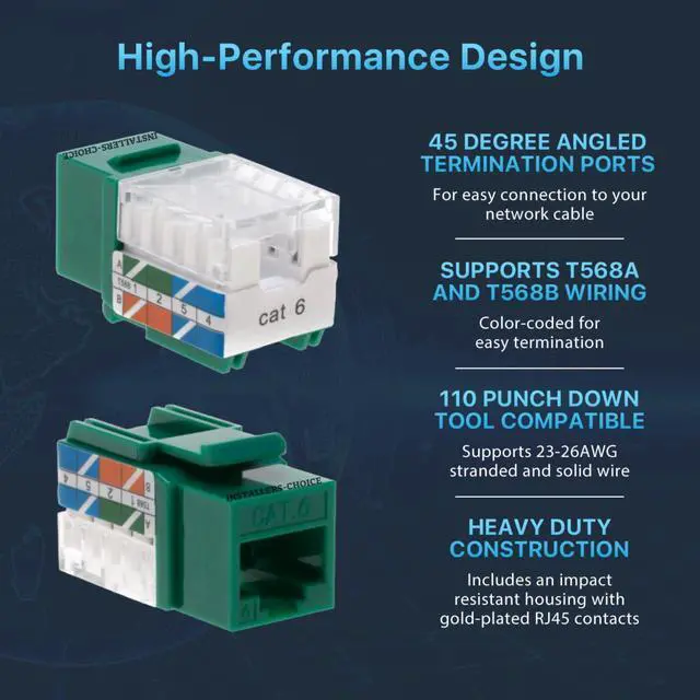 Termination Method: Cat6 keystone jacks may feature different termination methods, such as punch-down or tool-less termination. Punch-down jacks require the use of a punch-down tool to secure the individual wires onto metal contacts, while tool-less jacks hav