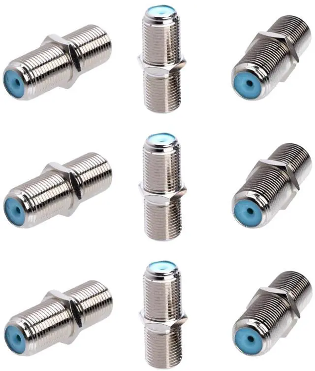Upgrade your coaxial connections with this 10-pack of high-performance F-Type coupler adapters. Engineered to extend F-pin coaxial cables without compromising signal strength, these inline barrel connectors are a perfect fit for cable boxes, TVs, satellite receivers, modems, and off-air antennas. Designed with flat-end ports to minimize interference and guard against moisture, each connector handles up to 3GHz frequencies, delivering stable, noise-free performance in both indoor and outdoor applications. The nickel-plated brass construction adds long-lasting durability and corrosion resistance, while the compact form factor adds just over an inch to your cable runperfect for tight spaces and flush wall plate installations.