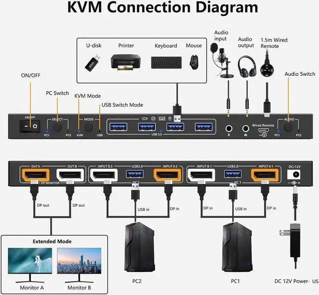 [( DP Port KVM Switch)] This is a perfect KVM switch for DP ports device to share keyboard mouse and monitor. When in copy mode the main screen can be copied to the second output screen. When in extend mode, the window from the main screen can be dragged to the second output screen.