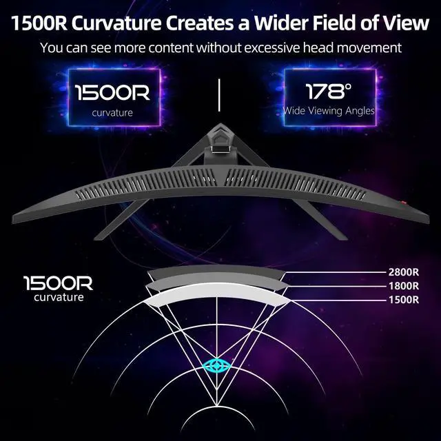 ^^ Stunning Picture Quality: With a brightness of 350 cd/m, 8-bit color depth, and 125% sRGB coverage, this 1500R curved gaming monitor offers vivid, rich colors and enhanced visual detail. HDR technology further elevates the viewing experience for immersive gaming.