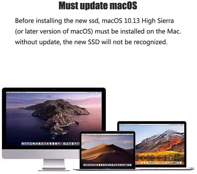 Important note: macOS 10.13 High Sierra (or later OS) must be installed on the Mac before installing the new ssd. These OS versions include an EFI firmware update for your Mac. Without the update, the new SSD will not be recognized.