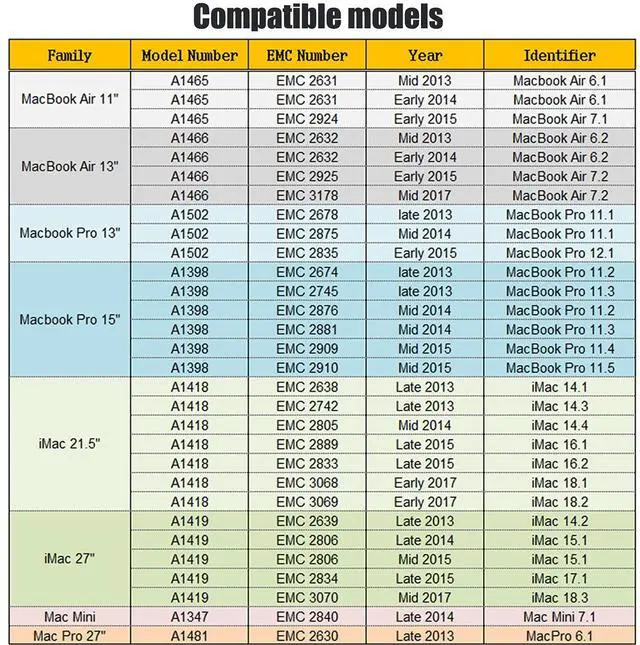 Compatible with: MacBook Air A1465 A1466 Mid2013-Mid2017, MacBook Pro A1502 A1398 Late2013-Mid2015, iMac A1418 A1419 Late2013-Mid2017.There is a very detailed table of supported models in the listing images. Please check carefully.The EMC number is the best way to match