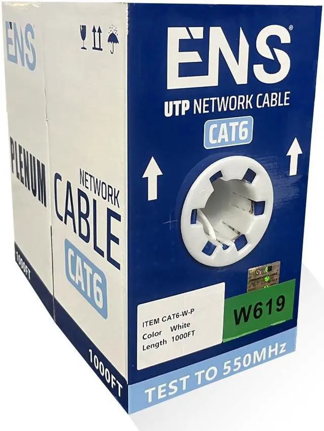 ENS Cat6 Plenum (CMP) Ethernet Cable, 1000ft, White, Solid Bare Copper, UTP, 23AWG, 550MHz, Bulk Cable Pull Box UL Certified & ETL Verified, Perfect for CCTV Security Surveillance System, White