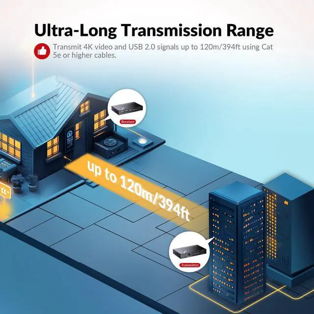 [(Effortless Remote PC Control KVM Extender)] The 4K USB Extender built with 3x USB 2.0 ports on the receiver. Control your remote PC easily with a keyboard, mouse, touch-screen panel, or other peripheral like 4K Webcam, Speakerphone, USB Flash, Scanner and Printer (high speed up to 480Mbps).
