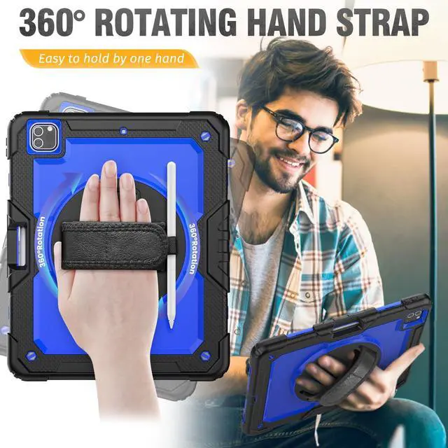 360deg Rotating Hand Strap & Stand -- This protective 12.9 inch case 2022 2020 provides a stable supports, with viewing/drawing/typing angles. You can hold it safely by one han