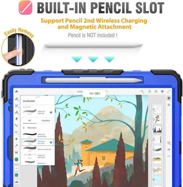 Shockproof & Screen Protector -- This ipad pro 12.9 inch case designed with durable anti shock material, soft silicone, hard plastic shell and built-in screen protector (2 covers to choose, one with built-in screen protector and one without). Sturdy pro 6th 5th generation case 12.9 always keep your i pad safe from shock, drop, scratch or accidental damages in daily use, or for school students, work outdoors, use in restaurant, travel around.