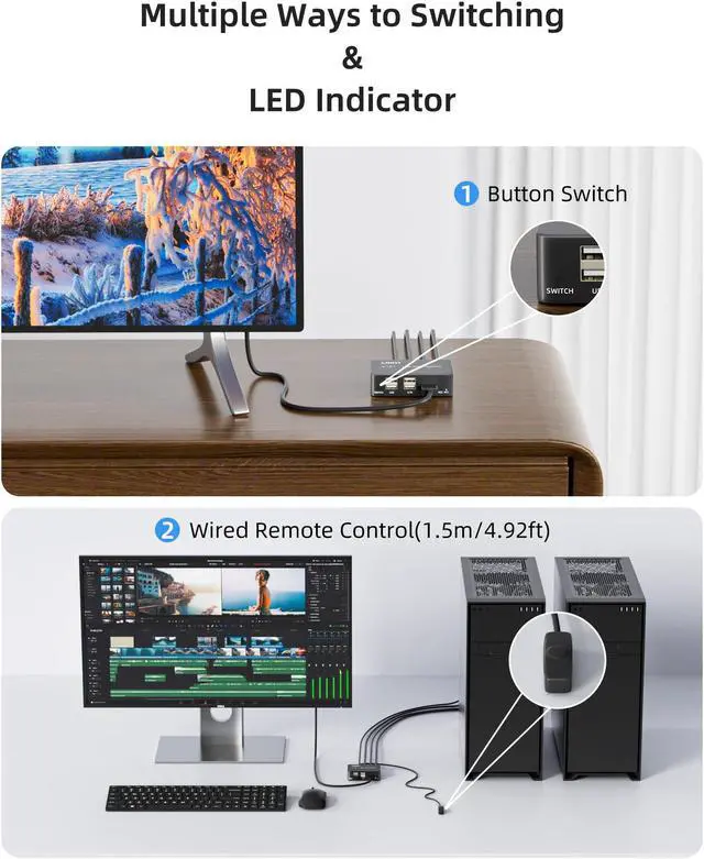 Plug and Play: Installing this HDMI KVM switch is straightforward. Simply use two HDMI cables to connect to our HDMI and USB switch, and then connect the provided USB cables. Once everything is connected, you can start using it immediately. We also include a desktop controller for convenient remote switching between computers.