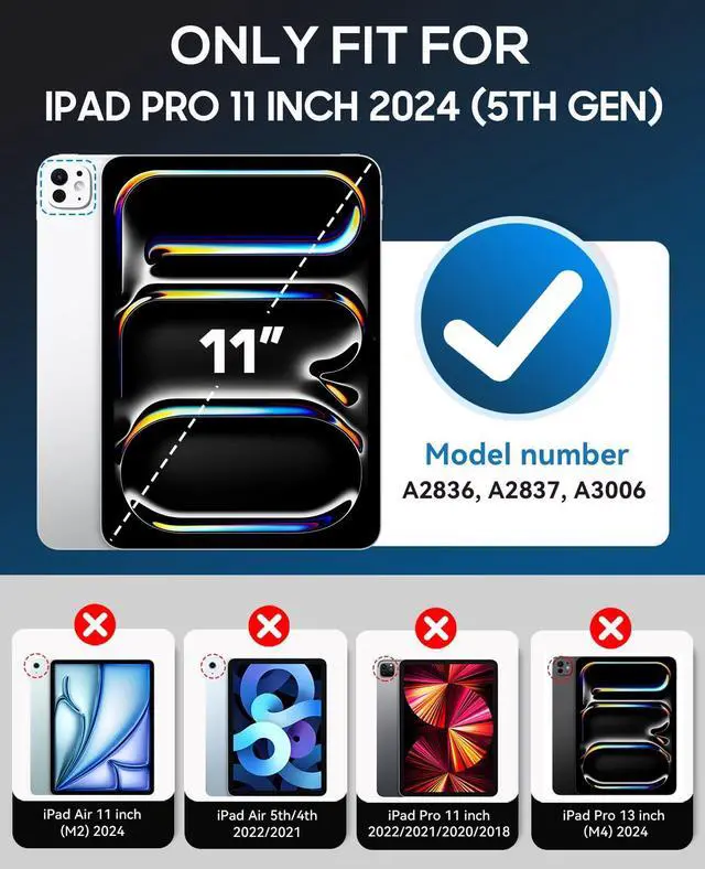 Compatibility: The Shockproof protective case for iPad 11 Pro case only fit for iPad Pro 11 inch 2024 M4(5th generation). Model Number: A2836, A2837, A3006. NOT compatible with any other devices. Please check the model number of your iPad before purchase