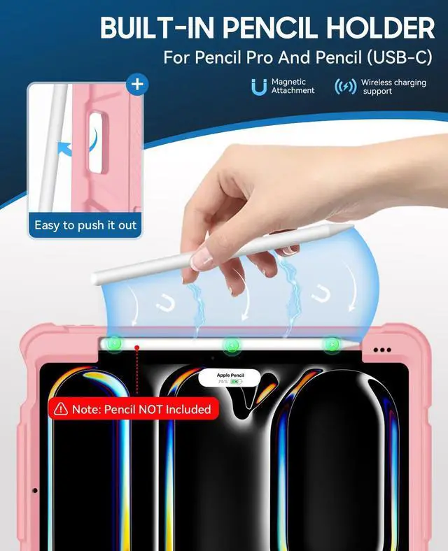 Built-in Pencil Holder: Case for iPad Pro 11 inch case 2024 fully supports Pencil Pro and Pencil (USB-C) with magnetic pairing and charging through the side groove. You can easily store the pencil in the case and push out it without removing your ipad 11 pro case. Note: Pencil NOT included