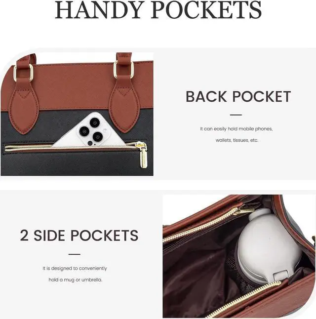 [(Multi-pocket Handbag)] The main compartment incorporates various pockets for organized storage, including a laptop compartment, tablet compartment, large zipper pocket, two open pockets, a small zipper pocket, two pen slots. Each pocket is strategically placed for easy access and efficient organization