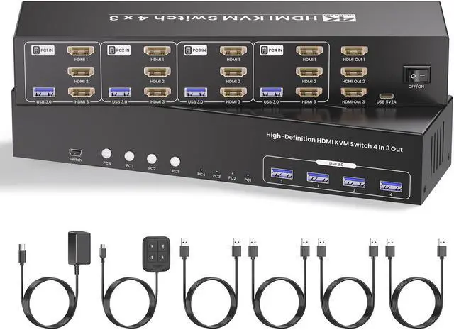 [(HDMI KVM Switch 3 Monitors 4 Computers)] The intuitive design of this KVM switch makes it easy to switch among 4 computers, saving you valuable time and effort. No more fumbling with cables or struggling to find the right input. This 4 port HDMI KVM switch allows you to control up to four computers using a single set of keyboard, mouse and 3 monitors setup.