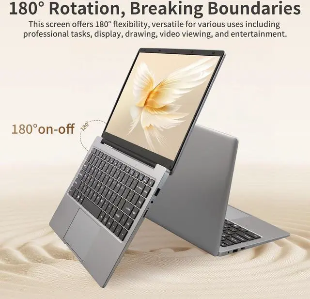 Light and Portable Little Laptop: The little laptop weighs about 1.25 kg and is 9 mm thick, and its stylish and lightweight design can even compete with big brands.The ultra-thin laptop is not only easy to fit into a bag of various sizes, which is very convenient to carry, but also equipped with a 180 degree opening and closing function, the screen opens horizontally,so that you can find a comfortable Angle of use in a variety of occasions. Whether for work or play, this laptop offers unmatched flexibility and convenience.