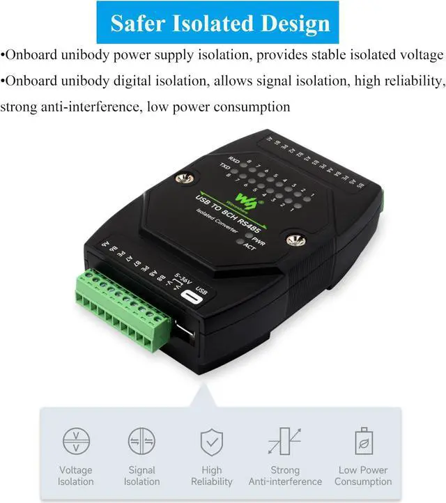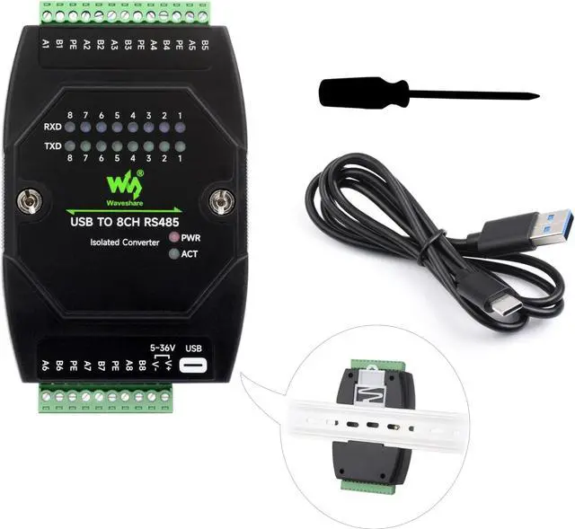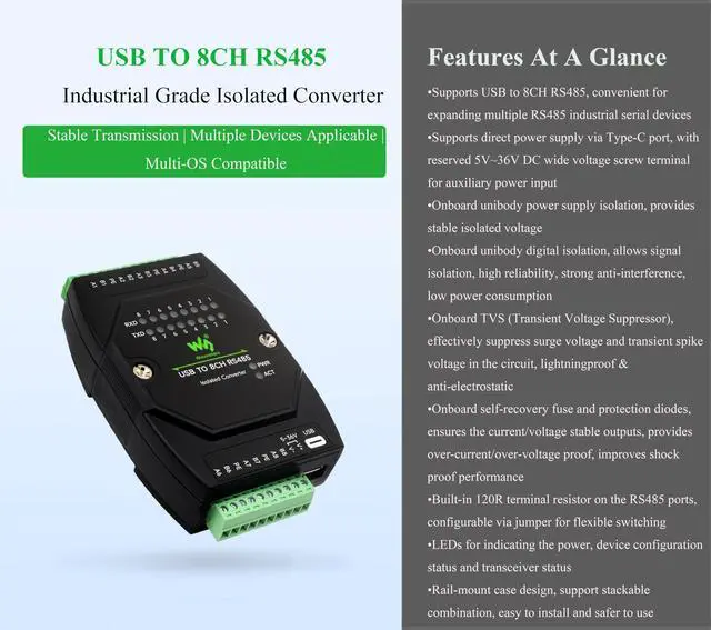 USB TO 8CH RS485 Industrial Grade Isolated Converter, USB To RS485 Adapter, Multiple Protection Circuits, Wall-mount and Rail-Mount Support, Multi-OS Compatible, Stackable Installation Support. Support Concurrent and Independent Communication for Each Channel