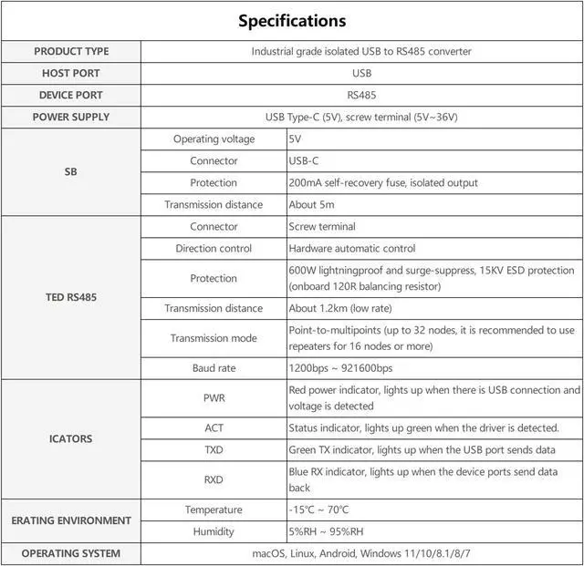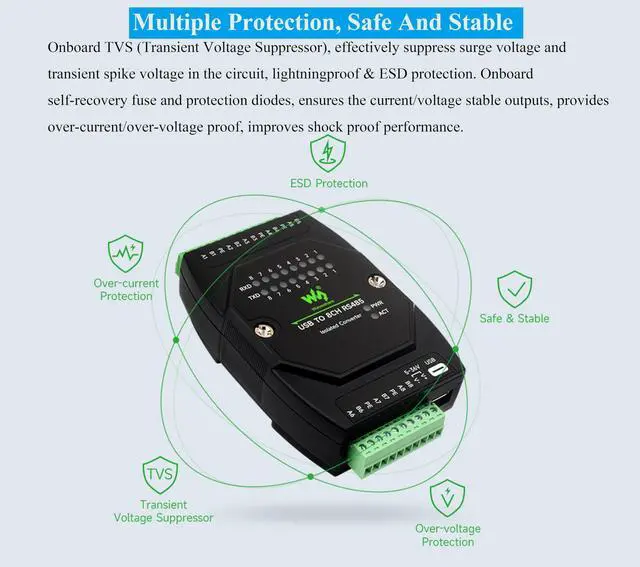 Protection: 600W lightningproof and surge-suppress, 15KV ESD protection (onboard 120R balancing resistor)