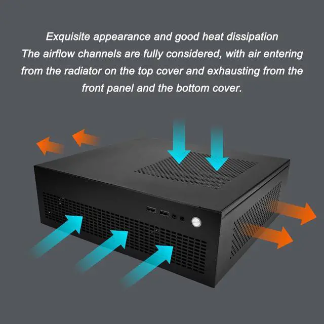 Effective Cooling System: The thoughtful design includes air vents for heat dissipation. With air intake over the CPU cooler and exhaust vents on the front panel and bottom sides, it ensures excellent cooling performance.