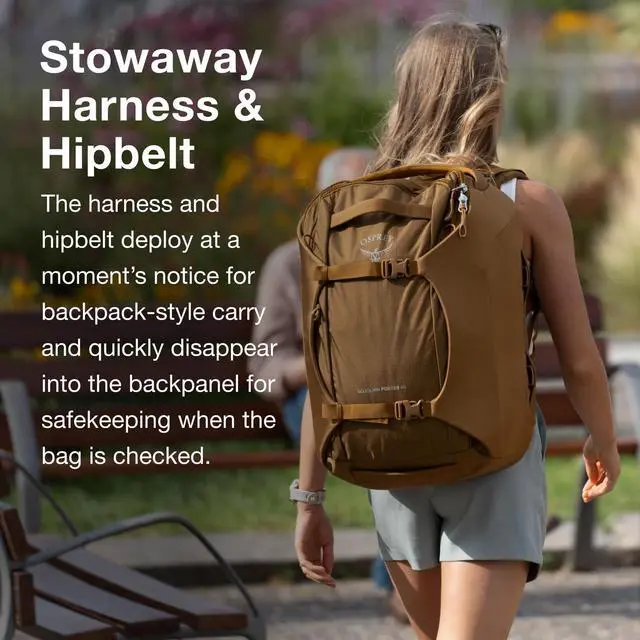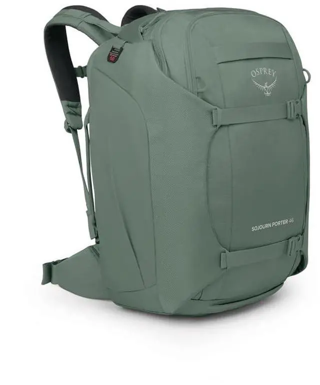 The Osprey Sojourn Porter 46 is a carry on travel backpack built for the modern explorer. Sized to fit most airline overhead compartments, this backpack maximizes capacity without sacrificing comfort or mobility. Heavy-duty bluesign APPROVED, 100% recycled high-tenacity nylon main body fabric and 100% recycled ballistic polyester bottom fabric protect your travel essentials for the long haul. Featuring a stable, close-to-body AirScape backpanel with tuckaway harness and hipbelt that offers breathable, comfortable support when worn and disappears when not in use. Our signature WingJacket compression system provides padded sidewalls that secure loads under pressurewhether your next adventure is backcountry skiing in British Columbia or alpine climbing in Chamonix.