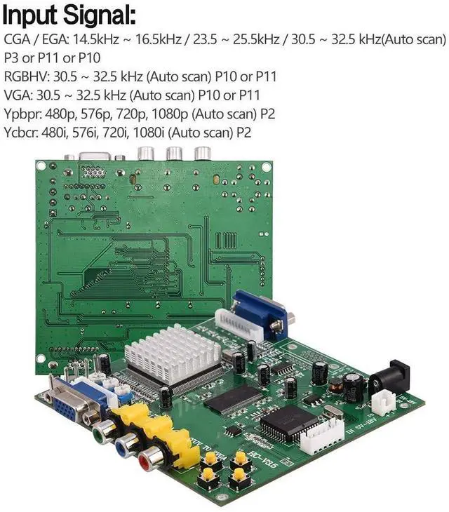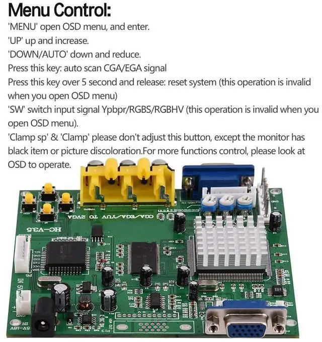 [TRUE DIGITAL 24-BIT A/D CONVERTER FOR TRUE 16.7 MILLION COLOR CONVERSION] The vga adapter has true digital 24-bit A/D converter for true 16.7 -million color conversion. Supports all types of VGA monitors (CRT, LCD, PDP, Projector, etc). ^^ [ON SCREEN DIAPLAY] The vga adapter support on Screen Display (English and Chinese). supports image position control & image zoom control. ^^ [CONVERT CGA/EGA/VGA/YUV/VGA/YUV] The vga adapter convert CGA/EGA/VGA/YUV component input toa VGA video. ^^ [CGA/EGA/VGA AUTO SCAN] The vga adapter CGA/EGA/VGA auto scan (15KHz, 24KHz, 31KHz). YUV Component auto scan (480i, 576i, 720i, 1080i, 480p, 576p, 720p, 1080p).
