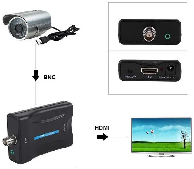 [USING LOW-POWER DIGITAL CHIP] The BNC To HDMI converter is using a new generation of low-power digital chip processing, 24 small uninterrupted work, little heat, stability, work. ^^ [USE 3D COMPENSATION TECHONOLOGY] The BNC To HDMI converter use of 3D compensation technology, effectively eliminate the fast moving picture jitter and smearing ^^ [ADOPTING SCALER VIDEO PROCESSING TECHONOLOGY] The BNC To HDMI converter is adopting Scaler video processing technology, a: The BNC is multiplied to the HD 1080P / 720P @ 50 / 60Hz output b: Can convert standard definition video format (480i, 480p, 720p, 1080i), through the Scaler UP technology, into the high-definition ^^ [ADOPTING I2S TECHONOLOGY] The The BNC To HDMI converter is adopting I2S technology, superimpose incoming L / R analog audio on the HDMI for the elimination of analog audio cable interference ^^ [THE SYSTEM DEFAULT TO BNC INPUT] The system defaults to BNC input. audio and video input, HDMI output.
