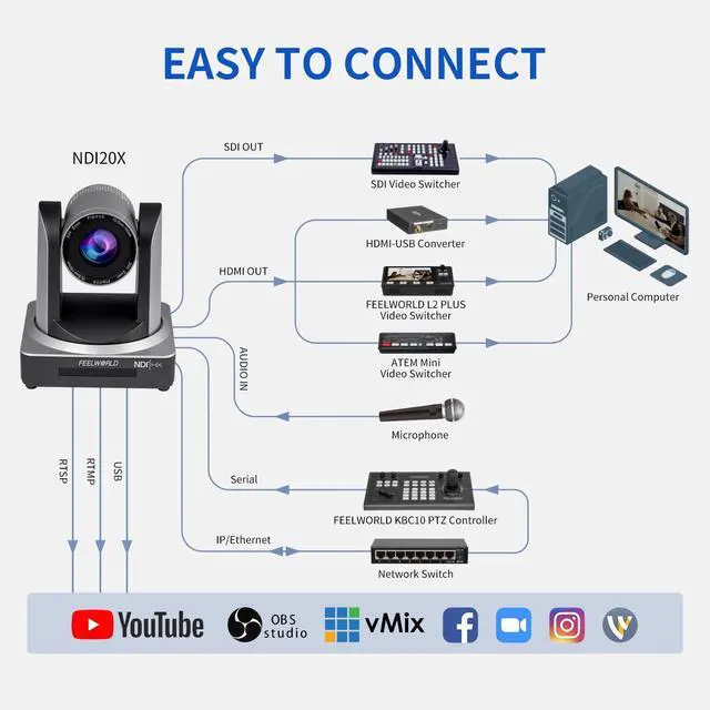 FEELWORLD NDI20X PTZ Camera Simultaneous 3G SDI HDMI NDI IP Live Streaming with 20X Optical Zoom 1080P 60fps PoE for Church Streaming Video Confrence