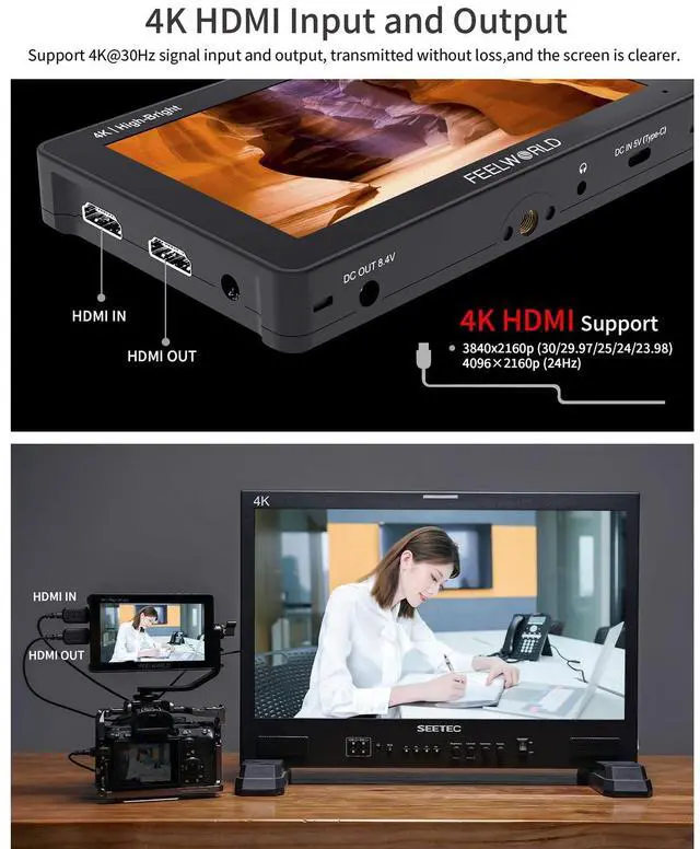 ^^ Accurate Exposure and FocusThis DSLR camera monitor combines histogram, false color, focus assist, and pixel-to-pixel tools for precise exposure/focus. Features embedded audio, frame guides, and nine-grid overlays for on-set accuracy. Its 1600nit 1920x1080 IPS screen boosts clarity during critical monitoring. ^^ Universal Camera Compatibility ^^ Flexible PowerEquipped with 4K HDMI in/out, it supports real-time signal monitoring and simultaneous distribution to multiple screens. Power options include Type-C input, F750 battery plate, and 8.4V DC output for flexible on-set operation. ^^ 4K HDMI & Multi-Power Pro SolutionsThe F6 Pro camera video monitor delivers 4K HDMI in/out (up to 60fps) for seamless multi-screen workflows, compatible with DSLRs, mirrorless cameras, and camcorders.