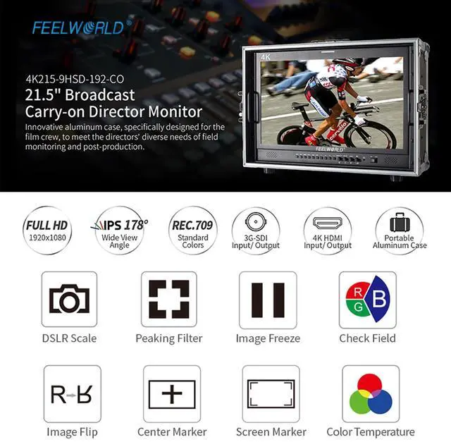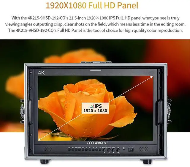 Color Restoration: wide color gamut LCD panel ensure the monitor more precise color restoration exquisite picture quality more rich color levels. ^^ True Color. Professional Color CalibrationFEELWORLD uses the professional Rec. 709 HD color standard, and uses the color calibration technology, with the professional instrument calibration at the factory, it can achieve monitor calibration efficiently and get accurate color reproduction easily, do not distort the color, show the real image when you shooting video. ^^ Innovation OSD Operation4K215-9HSD-192-CO not only set up four "F key" for peaking focus assist, check field, camera mode function, pixel to pixel, Center Marker, Safe Marker, Image Flip and so on, reserves the knob for professional users. Double functions and knob type coding switch are FEELWORLD 's exclusive technology feature, which will bring you more convenient and rapid operate feeling. ^^ Professional Monitoring4K215-9HSD-192-CO is an incredibly high quality monitor that's versatile enough to be used from the broadcast facility, mobile live production or on set for feature film production! The monitor comes with 3G/HD/SD-SDI, HDMI, YPbPr, Audio, Video, DVI inputs.