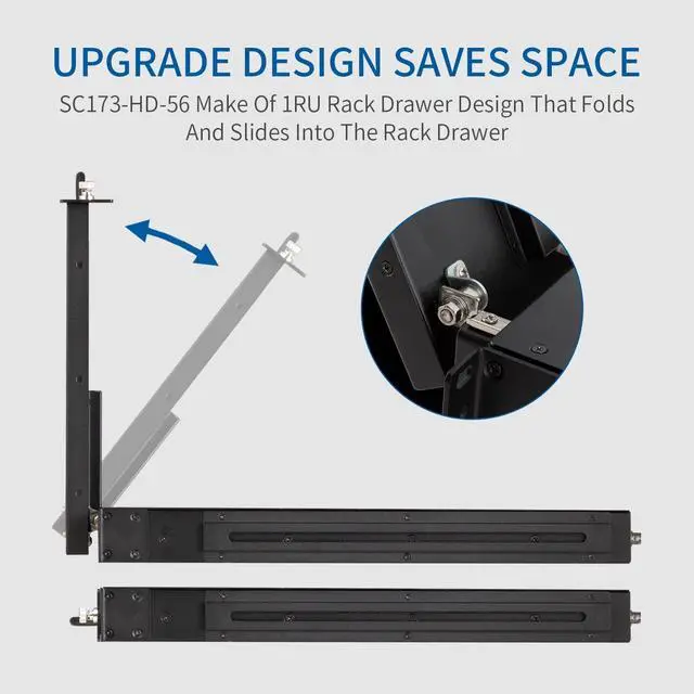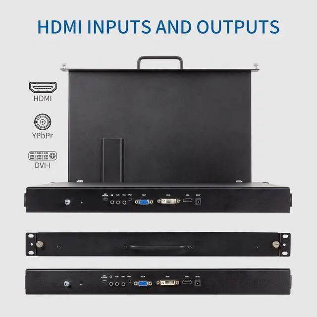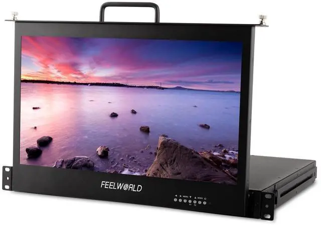 17.3-inch Full HD Monitor: FEELWORLD SC173-HD-56 retractable HDMI rack-mount monitor with 16:9 IPS panel and 1920 x 1080 resolution, offers 300 cd/m2 brightness, standard HDMI, DVI, VGA, YPbPr configuration, video and audio input, and you can also monitor audio via the 3.5 mm stereo headphone jack. There is a 12V DC input for power supply.