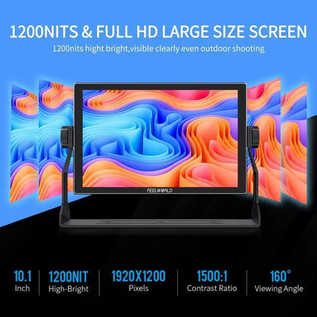 10.1 inch Touch Screen, 1200 Nits Daylight ViewableThe S10 camera Monitor is equipped with a 10.1 inch IPS touch screen with 1200 nits brightness, 4K full HD 1920 x 1080 resolution at 60Hz, 160viewing angle, 1500:1 contrast ratio, and has been calibrated by CALMAN professional color correction software, and the delta E value is 1.5. ^^ Professional Monitoring Software/Customized 3D LUTThe S10 camera monitor has lots of professional monitoring functions, such as Parade waveform, vector graph, brightness histogram, auxiliary focus, audio column, image flip, false color, etc.