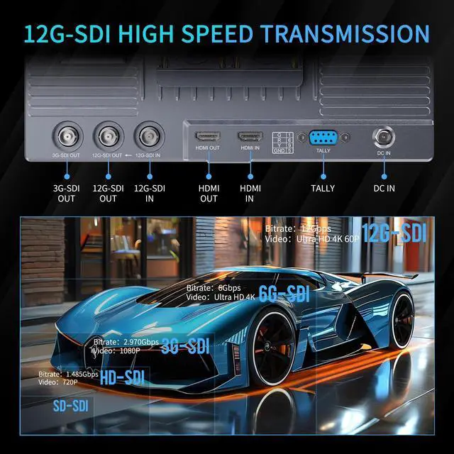 3D LUTs can be imported via SD card, and various creative effects can be realized in post-editing. ^^ 12G-SDI High Speed TransmissionThe S10 camera monitor utilizes 12G-SDI single-link technology, which is compatible with 6G-SDI/3G-SDI/HD-SDI/SD-SDI and supports a transmission rate of 12Gbps. Whether you want to convert SDI signals to HDMI during live broadcasts or convert HDMI signals to SDI during movie and TV production, the S10 can easily cope with the demands of professional filming. ^^ Intelligent Tally Indicator and Aluminum HousingThe S10 camera monitor is equipped with an intelligent Tally Indicator, which shows the status of the device in real time and facilitates teamwork.