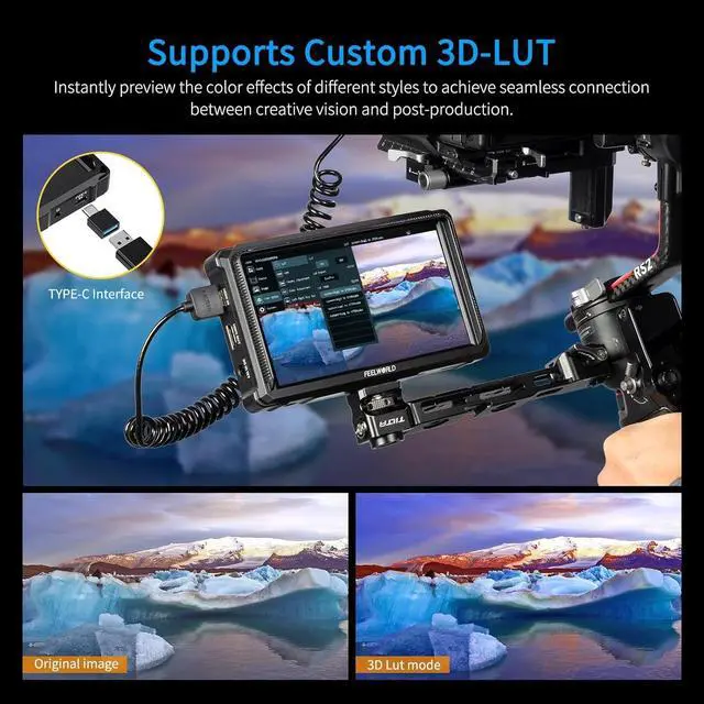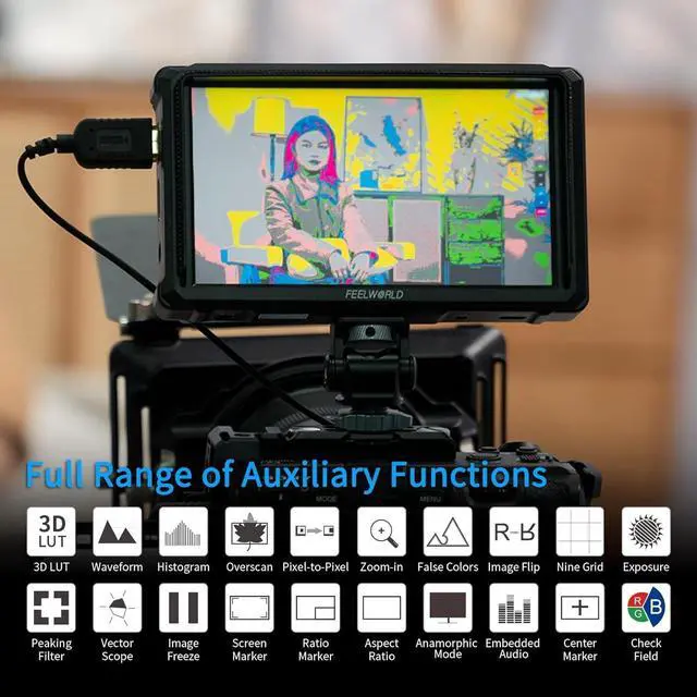 that clearly captures every detail. 1920x1080 high resolution, REC-709 color calibration, allowing you to enjoy sharper, richer color images. ^^ Advanced Video Assist FunctionsFW568 Pro camera field monitor includes a large number of useful features such as false colors, peaking filter, pixel to pixel, ratio marker, nine grids and more. Waveforms, vector scope, histograms, and embedded audio can be adjusted horizontally or vertically in the menu. ^^ Easy to Install External EquipmentAs an external camera monitor, the F970 external kit of the Feelworld FW568 PRO can be installed with wireless transmitters, LED lights, video converters, and more.