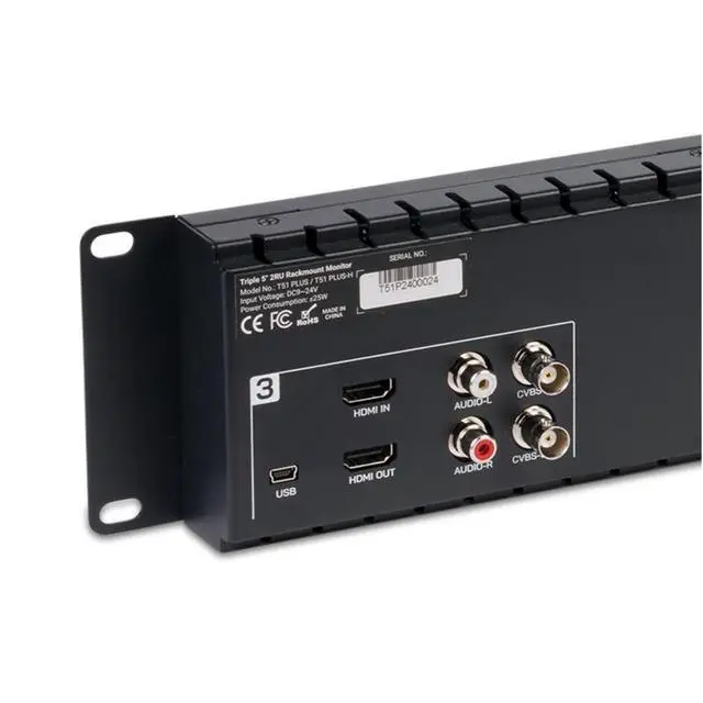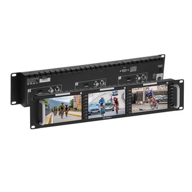 FHD1920x1080 IPS, view details with confidence ^^ Triple 2RU rackmount design, compact thin and lightweight design, which make it suitable for installing where the space is limited and also could be installed in the standard 19-inch rack ^^ Intuitive button operation, easy to setup ^^ Three-color Tally indicator, enhance team cooperation ^^ HDMI, Video, Audio(L/R) and 3G-SDI, HDMI, Video loop-through output