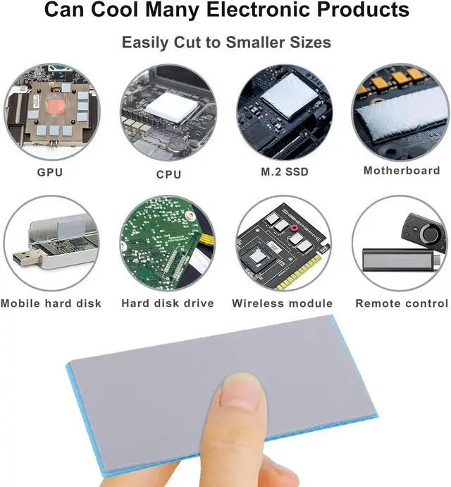 [(EXCELLENT THERMAL CONDUCTIVITY)] :Upgraded thermal silica gel material with 12.8 W/mK thermal conductivity, Density (G/cc): 3.1+-0.2 Hardness (Sc): 30~55; Breakdowm voltage: 9.8KV; Conductivity: None,our thermal pad greatly improve the heat transfer between the electronic elements and effectively cool the temperature down in seconds.