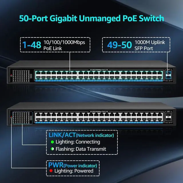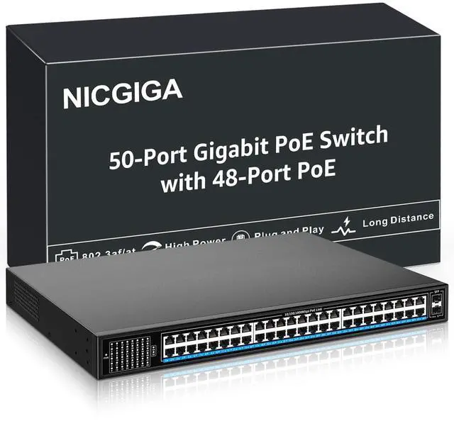 48 Port Gigabit PoE Switch Unmanaged with 48 Port IEEE 802.3 af/at PoE+@400W, 2 x 1G SFP, NICGIGA 50 Port Network Power Over Ethernet Switch, Desktop/Rackmount