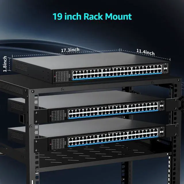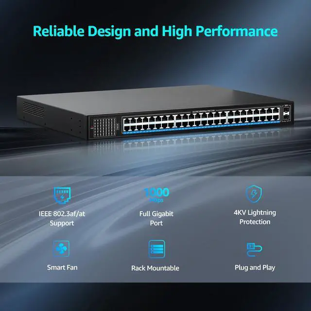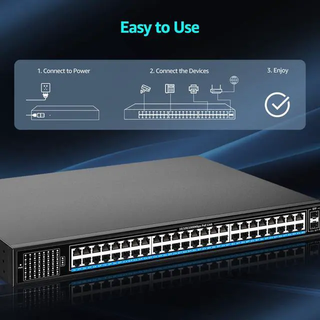 48-port Gigabit PoE+ switch with 48 PoE+ 10/100/1000 Mbps RJ45 ports, 2 Gigabit uplink SFP ports. SFP ports can provide more bandwidth and connect different devices such as routers, NVRs, etc.